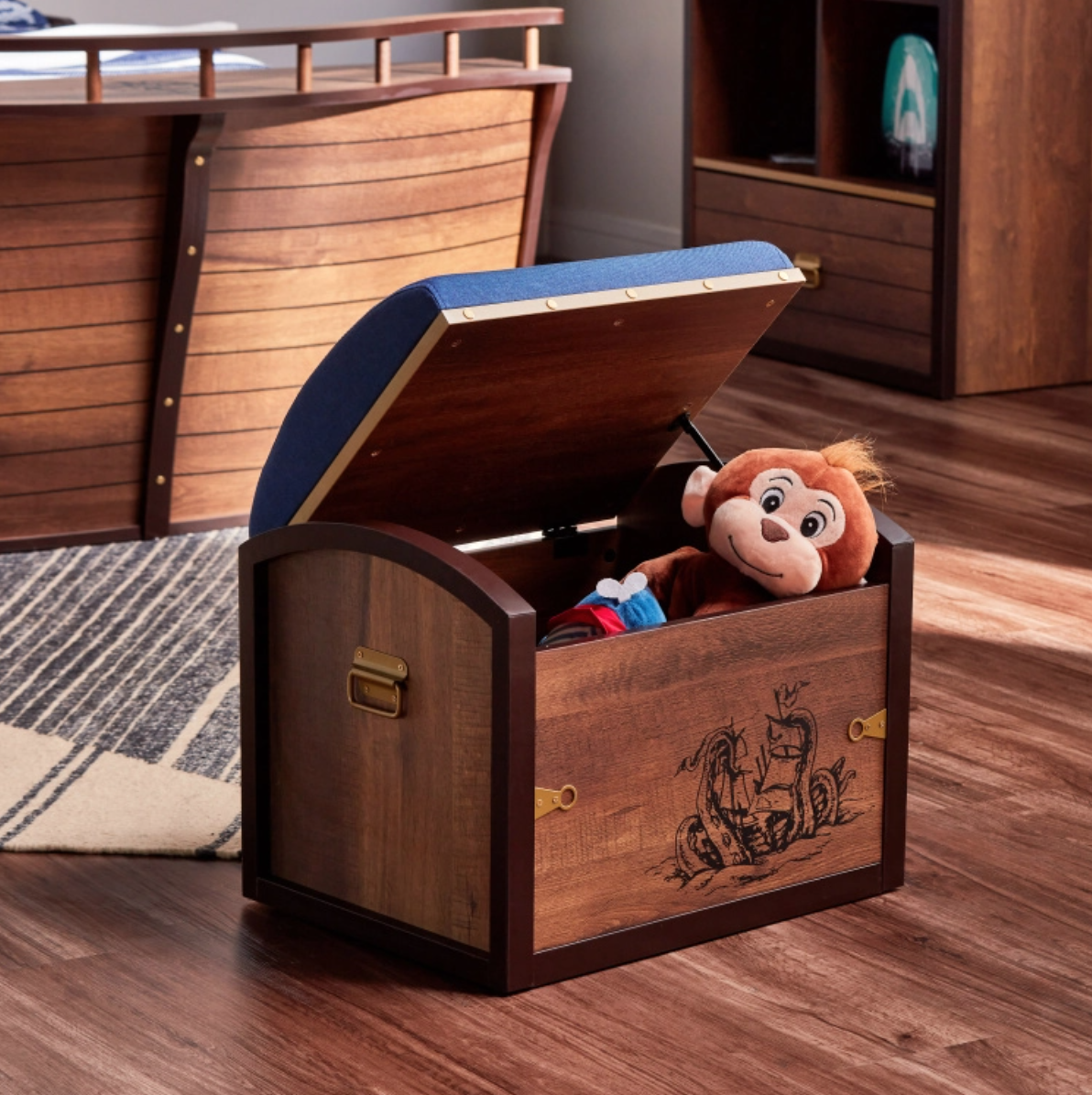 The meticulously crafted ‘pirate’s ship’ bed anchors the collection, guiding the design of the complementary case goods of the range. Each piece sparks imagination and blends functionality, catering to the needs of both children and parents. The Little Pirate collection is the perfect place to create long-lasting memories for your little ones!