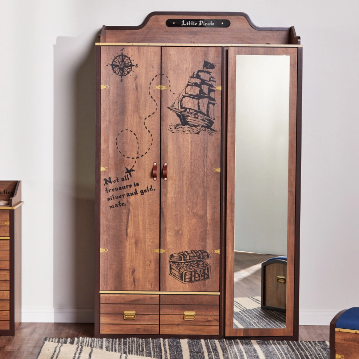 The Little Pirate range consists of nine SKUs: bed, trundle bed, nightstand, chest of drawers, mirror, desk with integrated hutch, bookshelf, wardrobe, and treasure trunk. Each piece was thoughtfully designed to contribute to an immersive pirate-themed environment while addressing practical storage and space-saving needs of growing children.